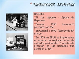 Este documento describe la historia, definición y objetivos del transporte neonatal, así como los tres niveles de atención en la regionalización de la atención neonatal. Explica los modos, tipos y clasificación del transporte neonatal, y los requisitos para la organización de un sistema de transporte neonatal efectivo, incluido el equipamiento, medicamentos, vehículos y principios fundamentales.