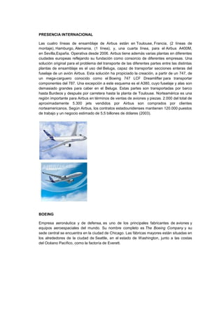 El documento trata sobre dos temas: la capacidad de carga y Airbus. Respecto a la capacidad de carga, explica que es el nivel máximo de población que puede soportar un medio sin daños, y cómo varían las tasas de natalidad y mortalidad en función de esta. En cuanto a Airbus, resume su origen como consorcio europeo creado para competir con Boeing, y su evolución hasta convertirse en la principal empresa aeronáutica de Europa.