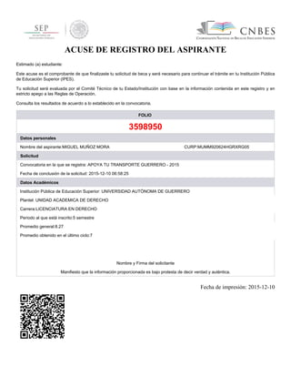 Este documento es un acuse de recibo de la solicitud de beca de Miguel Muñoz Mora. Confirma que completó el registro para el programa "Apoya tu Transporte Guerrero 2015" el 10 de diciembre de 2015. Su solicitud será evaluada por el comité técnico de acuerdo a su información académica como estudiante de la licenciatura en Derecho de la Universidad Autónoma de Guerrero con un promedio general de 8.27 y de 7 en su último ciclo.