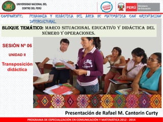 El documento presenta dos opciones para la programación de un docente. La Opción 1 implica seguir estrictamente un texto modelo, mientras que la Opción 2 implica tomar un texto como guía pero realizar adaptaciones considerando las características de los estudiantes. Se analizan los enfoques cognitivo y constructivista de la enseñanza y el aprendizaje, así como la teoría de la transposición didáctica y el triángulo didáctico que representa la relación entre el estudiante, el docente y el saber. Finalmente, se discuten los pro