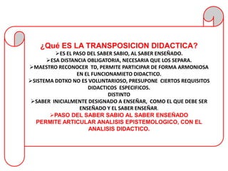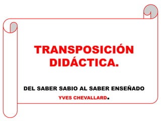 La transposición didáctica se refiere al proceso de transformación del saber científico en saber enseñado, el cual implica una selección y adaptación de los contenidos para hacerlos comprensibles para los estudiantes. Este proceso conlleva el paso del saber sabio al saber enseñado y una distancia necesaria entre ambos.