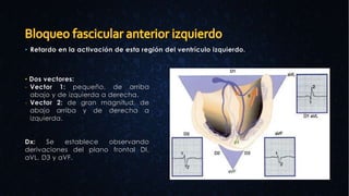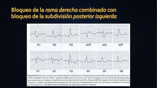 Este documento describe los patrones electrocardiográficos asociados con diferentes tipos de bloqueos de los fascículos del haz de His, incluyendo bloqueos bifasciculares anterior e inferior izquierdo y bloqueo trifascicular. Se proporcionan detalles sobre las características morfológicas del ECG, como la presencia de ondas Q, R y S empastadas en diferentes derivaciones, que permiten establecer el diagnóstico de cada tipo de bloqueo.