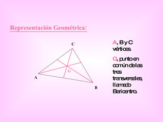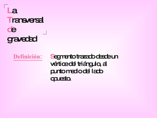 La transversal de gravedad es un segmento trazado desde un vértice de un triángulo hasta el punto medio del lado opuesto. Para construir las tres transversales de gravedad de un triángulo, se marca el punto medio de cada uno de sus lados y luego se unen los vértices con dichos puntos medios.