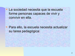 El documento argumenta que la escuela debe actualizar su enfoque pedagógico para formar a los estudiantes para vivir en la sociedad. Debe integrar el conocimiento académico con el conocimiento que surge de la experiencia de vida de los estudiantes. Los temas transversales no deben verse como contenidos separados, sino como elementos que enriquecen todas las áreas curriculares al contextualizarlos y dotarlos de significado a través de la realidad cotidiana y los problemas sociales.