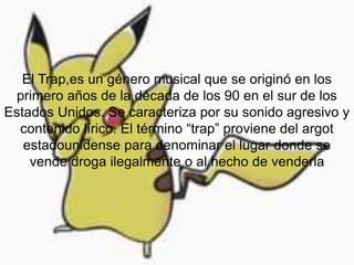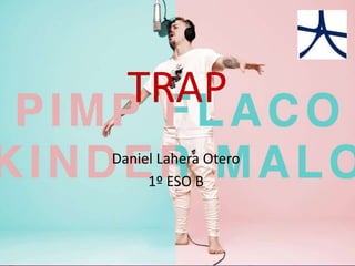 El documento resume la historia y características del género musical trap. Se originó en los años 90 en el sur de Estados Unidos y se caracteriza por su sonido agresivo y letras sobre drogas. Más tarde se popularizó en Latinoamérica y España, donde artistas como Kinder Malo, Pimp Flaco y Kaydy Cain han contribuido al movimiento trap local. El documento también menciona variantes como el trap feminista.