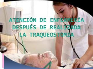 La traqueostomía es una incisión quirúrgica realizada en la tráquea para insertar un tubo y mantener la permeabilidad de la vía aérea. Se realiza cortando la piel, tejido adiposo y músculo del cuello para exponer la tráquea, luego se cortan los anillos traqueales e inserta la cánula. Las indicaciones incluyen obstrucciones de la vía aérea, secreciones abundantes, uso de respiradores mecánicos y como procedimiento profiláctico antes de cirug
