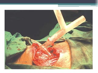 Este documento describe la traqueostomía, un procedimiento quirúrgico que consiste en la apertura de la tráquea a través del cuello para mantener la vía aérea abierta. Explica las indicaciones como obstrucción de la vía aérea, ventilación mecánica prolongada y limpieza de secreciones. También detalla los pasos de la técnica quirúrgica e identifica posibles complicaciones inmediatas, mediatas y tardías del procedimiento.