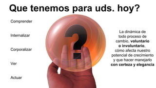 El documento aborda la importancia de comprender y gestionar los procesos de cambio personal y organizacional a través de cuatro pasos: conocer la situación actual, definir resultados deseados, conocerse a uno mismo y conectarse con el potencial. Se enfatiza cómo las creencias y limitaciones pueden obstaculizar el crecimiento y el impacto positivo del cambio en nuestras vidas. Cita a figuras como Marcus Aurelius y Viktor Frankl para reforzar la necesidad de elegir nuestra respuesta ante las circunstancias.