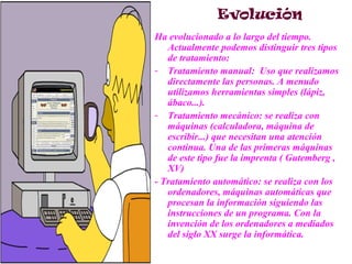 La informática ha evolucionado desde el tratamiento manual hasta el automático con ordenadores, que son máquinas interconectadas capaces de procesar información siguiendo programas. Existen varios tipos de ordenadores, que van desde grandes sistemas para empresas hasta microordenadores personales, y su evolución ha sido impulsada por avances en microelectrónica. Los ordenadores se componen de hardware, que incluye la unidad central y periféricos, y software, que comprende los programas necesarios para su funcionamiento.
