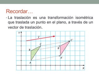 Las transformaciones isométricas incluyen traslaciones, que desplazan un punto en el plano mediante un vector determinado. Se presentan ejemplos de cómo calcular las nuevas coordenadas de un punto traslacionado y ejercicios para practicar la ubicación y traslado de puntos y figuras en el plano. Se concluye que, para determinar un punto trasladado o el vector de traslación entre dos puntos, se utilizan operaciones de suma y resta de sus coordenadas.