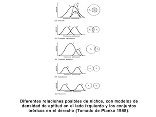 El documento describe diferentes conceptos relacionados con el nicho ecológico. Explica que el traslape de nichos ocurre cuando dos organismos comparten los mismos recursos, pero no necesariamente competirán. La amplitud de nicho se refiere a qué tan generalista u especialista es un organismo, dependiendo de la variedad de recursos que utiliza. Finalmente, los equivalentes ecológicos son organismos que han evolucionado de forma independiente pero ocupan nichos similares en diferentes comunidades.