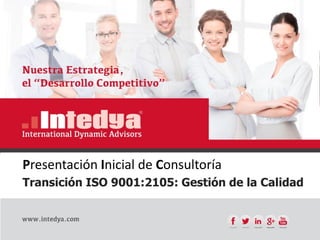 Este documento presenta los servicios de consultoría de INTEDYA para la transición a la norma ISO 9001:2015 de gestión de calidad. Explica que la nueva versión de 2015 introduce cambios importantes que requieren una implementación efectiva. INTEDYA ofrece servicios de consultoría para realizar esta transición de forma exitosa en tres años, logrando para las organizaciones los beneficios de mejora continua y cumplimiento de requisitos de calidad.