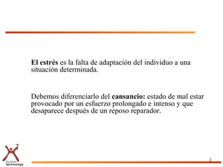 El documento describe diferentes tipos de estrés y técnicas para afrontarlo. Explica que hay estrés positivo y negativo, y que la falta de adaptación a una situación causa estrés. También enumera métodos como la planificación, comunicación y relajación para controlar el estrés, así como factores internos y externos que lo provocan como el desorden, ruido o confusión mental.