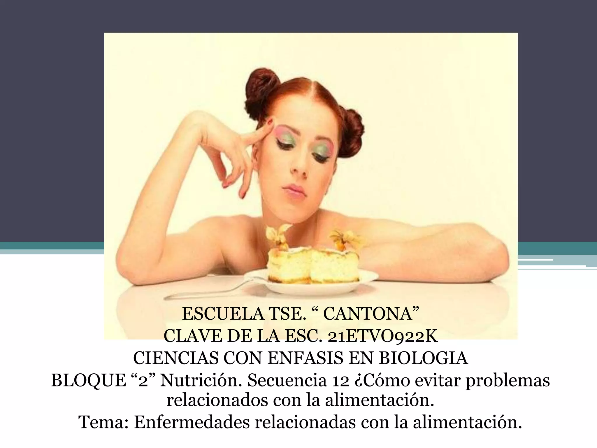 Este documento habla sobre las enfermedades relacionadas con la alimentación. Explica que una alimentación equilibrada es importante para la salud y prevenir enfermedades. Cuando hay desequilibrios en la dieta, se altera el funcionamiento del organismo y pueden ocurrir desórdenes como enfermedades gastrointestinales, desnutrición, anorexia, bulimia, sobrepeso u obesidad. Finalmente, enfatiza la importancia de mantener hábitos alimenticios balanceados y realizar ejercicio físico regularmente para una buena sal