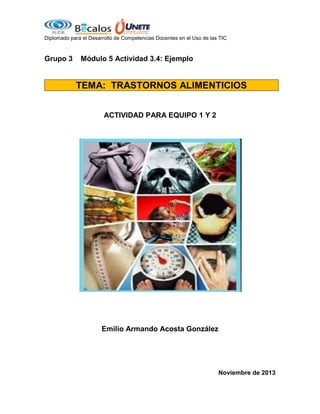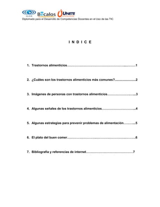 Este documento trata sobre los trastornos alimenticios más comunes como la anorexia, la bulimia y la obesidad. Explica sus síntomas y efectos en la salud. También proporciona estrategias para prevenir problemas alimenticios como aprender sobre nutrición balanceada, establecer hábitos alimenticios regulares y buscar ayuda profesional si es necesario.
