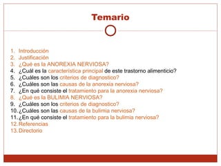 Este documento presenta una orientación sobre trastornos alimenticios para adolescentes. Explica la anorexia nerviosa, sus criterios de diagnóstico y causas, así como su tratamiento. También describe la bulimia nerviosa, incluyendo sus criterios de diagnóstico, causas y tratamiento. El objetivo es prevenir estos trastornos alimenticios mediante la educación de adolescentes, maestros y padres.