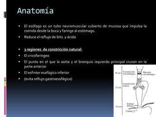 Este documento describe la anatomía, fisiología y principales trastornos del esófago. Explica que el esófago es un tubo muscular que transporta los alimentos desde la boca al estómago. Describe condiciones como la enfermedad por reflujo gastroesofágico, la acalasia, el espasmo esofágico difuso y otros trastornos de la motilidad esofágica. Explica los síntomas, pruebas de diagnóstico y opciones de tratamiento para estas afecciones esofágicas.