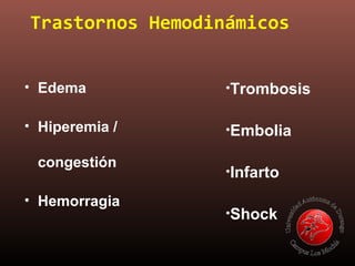 Este documento resume varios trastornos hemodinámicos como el edema, la hiperemia, la hemorragia, la trombosis, la embolia, el infarto y el shock. Describe las causas, características macroscópicas y microscópicas de cada uno. Explica conceptos como la fisiopatología del edema, las diferentes formas de hemorragia, los tipos de trombos y embolias, y las fases del shock.