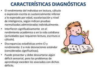 Este documento describe los principales trastornos del aprendizaje presentados en la niñez. Identifica cuatro trastornos específicos: trastorno de lectura, trastorno de cálculo, trastorno de la expresión escrita y trastorno del aprendizaje no especificado. Describe las características diagnósticas de cada uno y sus causas probables. También menciona síntomas comunes en los niños con estos trastornos y recomendaciones de tratamiento.