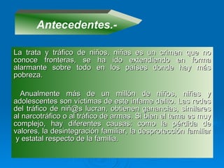 1) La trata y tráfico de niños, niñas y adolescentes es un problema global que afecta a más de un millón de personas anualmente y genera ganancias multimillonarias para las redes criminales. 2) Estos actos son ilegales y dañinos ya que conllevan la explotación y abuso físico y sexual de las víctimas. 3) El documento describe los tipos de trata, como la explotación laboral y sexual, y resalta la importancia de denunciar estos crímenes ante las autoridades competentes.