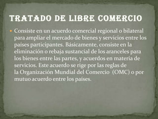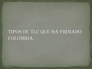 El documento describe varios tratados de libre comercio que ha firmado Colombia, incluyendo acuerdos con Estados Unidos, Canadá, Chile, los países de la Comunidad Andina y MERCOSUR. Además, explica brevemente el proceso de negociación de los tratados de libre comercio entre los gobiernos interesados.