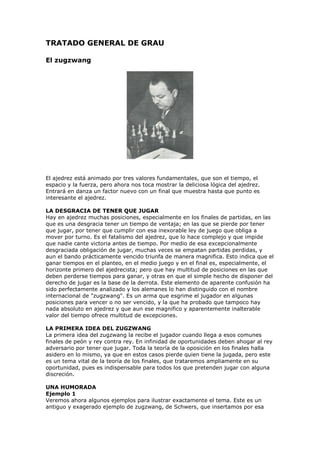 Este documento resume varios capítulos del Tratado General de Ajedrez de Roberto G. Grau, incluyendo el zugzwang, mates típicos como la penetración de la dama a través de la columna h y el mate de la coz, y otros conceptos estratégicos y tácticos como los peones doblados y sacrificios. Explica estos temas a través de ejemplos de partidas y posiciones clave.