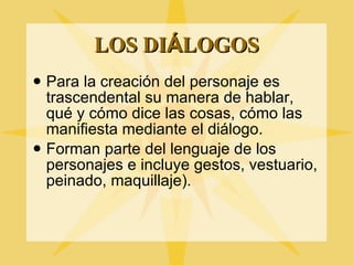 El documento habla sobre la importancia de los diálogos para crear personajes coherentes en una obra audiovisual. Explica que los diálogos deben reflejar la identidad del personaje y ser directos y claros para expresar lo esencial de la historia. También menciona problemas comunes como la retórica y la redundancia. Luego, se enfoca en explicar el tratamiento, que describe las acciones y la evolución de los personajes a través de escenas y secuencias, sin diálogos definitivos, para desarrollar mejor la historia antes de