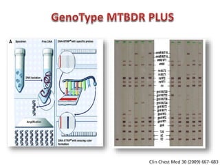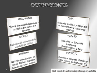 Este documento trata sobre el tratamiento de la tuberculosis. En 3 oraciones o menos: El tratamiento de la tuberculosis requiere el uso de múltiples antibióticos combinados durante períodos prolongados para eliminar todas las bacterias, incluidas las que crecen lentamente. El tratamiento debe individualizarse dependiendo de los resultados de pruebas de sensibilidad y factores como la resistencia a medicamentos. Se recomiendan esquemas de al menos 6 meses para la tuberculosis sensible y de 18 meses para la resistente, con seguimiento estricto para asegurar la adherencia y detección
