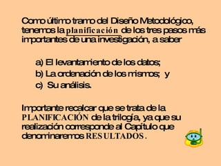 El documento presenta los tres pasos del tratamiento de datos en una investigación: 1) el levantamiento de datos a través de instrumentos como documentos, observaciones y entrevistas; 2) el ordenamiento de los datos según el instrumento utilizado; y 3) el análisis de datos mediante métodos personales o programas computacionales como SPSS y CAQDAS para investigaciones cualitativas. Se usa un ejemplo para ilustrar estos pasos.
