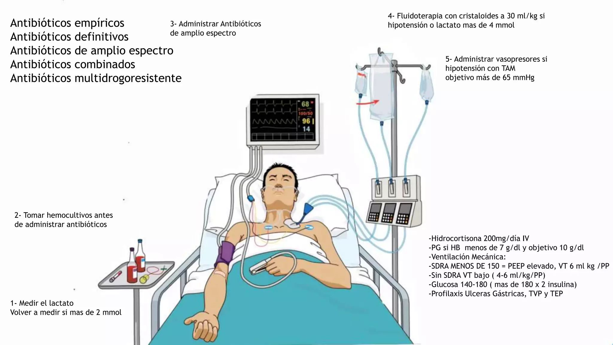 Este documento presenta las medidas de resucitación inicial y el manejo posterior para pacientes con sepsis grave o choque séptico. En la primera hora se recomienda medir el lactato, obtener hemocultivos, administrar antibióticos de amplio espectro y fluidoterapia rápida. Posteriormente, se enfoca en metas de reanimación, cobertura antibiótica, soporte ventilatorio, control glucémico y profilaxis.