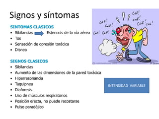 Este documento proporciona información sobre el asma bronquial, incluyendo sus signos y síntomas, clasificación, diagnóstico y tratamiento. Describe las características del asma leve, moderada y severa, y explica cómo se clasifica el asma como persistente o intermitente. También cubre los métodos de diagnóstico como la espirometría y las pruebas cutáneas de sensibilidad, y destaca la importancia del diagnóstico temprano en lactantes y niños pequeños.