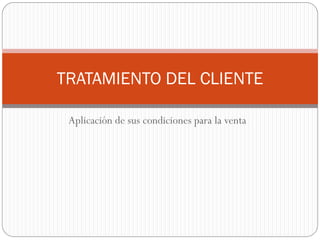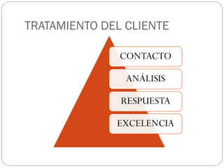 El documento proporciona orientaciones sobre el tratamiento del cliente. Explica que es importante analizar al cliente, escuchar activamente para comprender sus necesidades, y ofrecer soluciones personalizadas que superen sus expectativas. El objetivo es brindar un servicio excelente que mejore las ventas, la satisfacción y las relaciones.