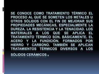 El tratamiento térmico es un proceso que mejora las propiedades mecánicas de metales, especialmente aceros y fundiciones, mediante calentamiento y enfriamiento controlado. Estos tratamientos modifican la estructura cristalina de los materiales, permitiendo reducir esfuerzos internos y mejorar la tenacidad y dureza. Procesos como el temple y el recocido son fundamentales para equilibrar la dureza y la fragilidad del acero, optimizando su uso en la industria metalmecánica.