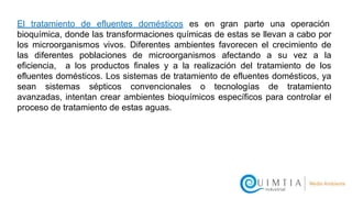 El tratamiento de efluentes domésticos es un proceso bioquímico realizado por microorganismos en entornos aerobios y anaerobios, afectando la eficiencia del tratamiento. Se producen tres tipos básicos de transformaciones bioquímicas: eliminación de materia orgánica soluble, digestión de materia orgánica insoluble y transformación de materia inorgánica. Los sistemas de tratamiento aerobios y anaerobios están diseñados para romper y estabilizar la materia orgánica, optimizando la reducción de la demanda bioquímica de oxígeno y la eliminación de nitrógeno.