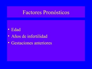 Este documento resume los factores pronósticos y tratamientos más comunes para la infertilidad, incluyendo la inducción de ovulación, reproducción asistida, y cirugía. Describe los diferentes medicamentos y procedimientos utilizados en la inducción de ovulación y reproducción asistida, así como las consideraciones para decidir entre inseminación intrauterina e intervenciones más avanzadas como FIV e ICSI.