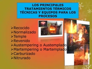 Los tratamientos térmicos del acero mejoran sus propiedades a través de procedimientos que involucran calentamiento y enfriamiento controlado, destacando técnicas como recocido, normalizado y temple. Cada técnica busca optimizar características específicas, como dureza o tenacidad, y la elección del método depende de la estructura microquímica deseada. En la actualidad, la industria ha evolucionado para adoptar estos tratamientos, asegurando productos de calidad que satisfacen las exigencias del mercado.