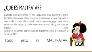 Este documento trata sobre el maltrato y el derecho a ser tratado con respeto. Explica que el maltrato incluye la agresión física, los insultos y la exclusión social. Todas las personas tienen el derecho a no ser maltratadas y la responsabilidad de tratar a los demás con respeto. Ofrece consejos sobre qué hacer si alguien es víctima o testigo de maltrato, como mantener la calma, pedir ayuda a un adulto y no guardar silencio.
