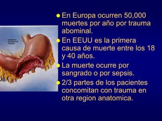 Este documento describe las características clave del trauma abdominal, incluyendo su clasificación, síntomas, diagnóstico y tratamiento. El trauma abdominal puede ser penetrante u no penetrante y causa la muerte principalmente por sangrado o sepsis. Exámenes como rayos X, ultrasonido, TAC y lavado peritoneal son útiles para el diagnóstico, mientras que la laparotomía es indicada ante hallazgos positivos o signos de lesión interna. Los órganos más afectados son el hígado, bazo e intestino delgado