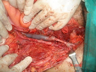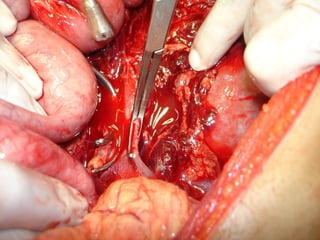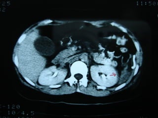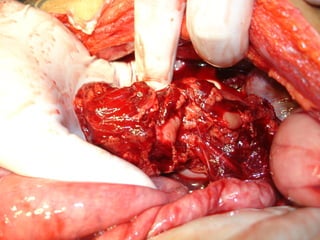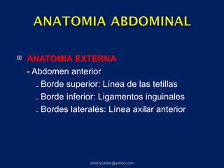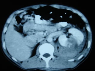 El documento describe la anatomía externa e interna del abdomen, los tipos de trauma abdominal cerrado y penetrante, la evaluación y el tratamiento del trauma abdominal. Explica los criterios para el tratamiento no quirúrgico del trauma abdominal cerrado y del trauma esplénico y hepático, incluidas las complicaciones y su manejo. También cubre el trauma renal y los criterios para considerar un lavado peritoneal diagnóstico positivo.