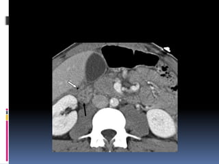 Este documento resume la utilización de la tomografía computarizada (TC) multidetección en el trauma abdominal. Explica que la TC es una herramienta diagnóstica excelente para excluir lesiones intraabdominales en pacientes con trauma severo. También describe los protocolos recomendados por ATLS para el manejo de pacientes con trauma, incluyendo el uso inicial de ultrasonido y rayos X, seguido potencialmente por TC. Además, presenta clasificaciones de gravedad para lesiones hepáticas, esplénicas, renales, pancreáticas