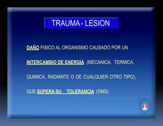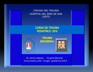 El documento proporciona información sobre el trauma abdominal en niños. Define el trauma como un daño físico al organismo causado por la transferencia de energía. Explica que el abdomen puede verse comprometido en hasta un 20% de los casos de trauma, siendo más frecuente en niños que en niñas. Describe las lesiones más comunes de los órganos abdominales y presenta algoritmos para la evaluación y manejo del trauma abdominal en la emergencia.
