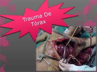 El documento describe los conceptos fundamentales de trauma torácico, incluyendo las definiciones de trauma abierto y cerrado, las principales causas de muerte por trauma torácico, y la clasificación y fisiopatología de lesiones torácicas como neumotórax, hemotórax masivo y taponamiento cardíaco. Además, detalla los pasos de la evaluación y manejo inicial de pacientes con trauma torácico, incluyendo la revisión primaria, resucitación, revisión secundaria y consideraciones de traslado