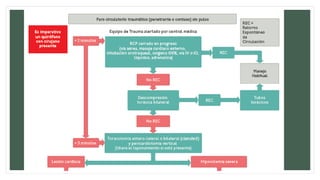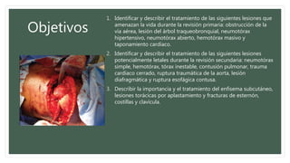 El documento aborda el trauma torácico y sus tratamientos urgentes durante las evaluaciones primaria y secundaria, resaltando lesiones que amenazan la vida como el neumotórax y hemotórax. También se discuten las complicaciones y los procedimientos diagnósticos y terapéuticos necesarios para manejar eficazmente estas lesiones. Se enfatiza la importancia de una intervención rápida y adecuada para mejorar las tasas de supervivencia en pacientes con traumatismos torácicos.