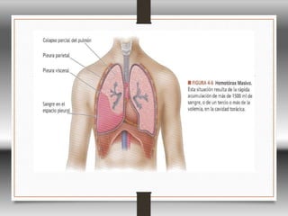 Este documento proporciona información sobre el diagnóstico y tratamiento de varias lesiones torácicas traumáticas. Describe las consecuencias fisiológicas del trauma torácico y las etapas clave de la revisión primaria y secundaria. Explica las características clínicas, el diagnóstico y el manejo inicial de afecciones como el neumotórax, hemotórax, neumotórax a tensión y lesión del árbol traqueobronquial.