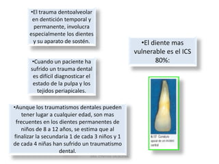 El documento habla sobre el trauma dentoalveolar en dientes temporales y permanentes. Explica que los dientes más vulnerables son los incisivos centrales superiores, y que los traumatismos son más comunes en niños de 8 a 12 años. Detalla la importancia de realizar una evaluación clínica e historial del accidente, y clasifica los diferentes tipos de fracturas, luxaciones y avulsiones dentales, indicando los signos, síntomas y tratamiento de cada una.