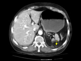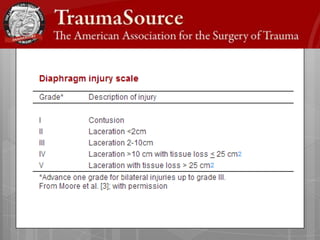 Este documento describe la anatomía, epidemiología, mecanismos de lesión, cuadro clínico, diagnóstico y tratamiento quirúrgico del trauma diafragmático. El diafragma se inserta en las últimas costillas y vertebras torácicas superiores y separa el tórax del abdomen. Las lesiones diafragmáticas ocurren más comúnmente por el lado izquierdo como resultado de traumas cerrados o penetrantes, y con frecuencia se asocian a otras lesiones torácicas o abdominales. El diagnóstico se basa