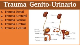 Este documento resume los diferentes tipos de trauma genitourinario, incluyendo trauma renal, ureteral, vesical, uretral y genital. Describe los mecanismos de lesión, anatomía, diagnóstico, estudios de imagen, tratamiento y complicaciones de cada tipo de trauma. El objetivo es proporcionar una guía para la evaluación y manejo clínico apropiado de pacientes con trauma genitourinario.