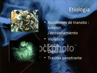 Este documento describe las lesiones traumáticas de la columna vertebral y la médula espinal. Detalla la etiología, anatomía, mecanismos de lesión, clasificación, síndromes y evaluación de estas lesiones. La prioridad en el manejo es la inmovilización, evaluación neurologica y tratamiento para prevenir daño secundario a la médula espinal.