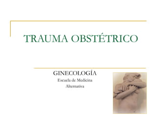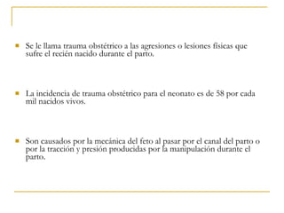 El documento describe el trauma obstétrico ginecológico, definido como las agresiones o lesiones físicas que sufre el recién nacido durante el parto. Algunas lesiones comunes incluyen fracturas de huesos, hemorragia intracerebral, lesión del plexo braquial y hematomas abdominales. Los factores de riesgo incluyen partos prolongados o rápidos, presentaciones anormales, baja estatura materna y recién nacidos con peso o cabeza grande. Las complicaciones pueden ser fracturas, hemorragias, as