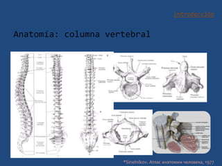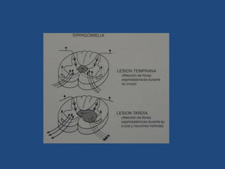 1) El documento describe la anatomía, fisiopatología, clasificación, diagnóstico y tratamiento del traumatismo raquimedular. 2) Se detalla los diferentes tipos de fracturas y luxaciones vertebrales, así como los síndromes clínicos resultantes de la lesión medular. 3) El tratamiento incluye medidas prehospitalarias, quirúrgicas y rehabilitación, buscando prevenir daños secundarios y facilitar la recuperación neurológica.